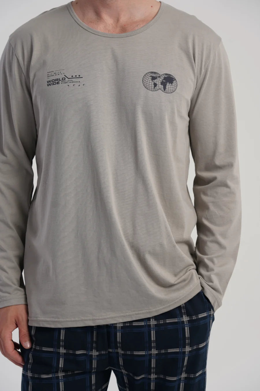 Bluzka w beżowym kolorze została ozdobiona niewielkim nadrukiem na piersi, dodającym jej subtelnego charakteru. Długie spodnie utrzymane w granatowej kolorystyce z klasycznym wzorem w kratę to ponadczasowy motyw, który świetnie komponuje się z prostą górą.
