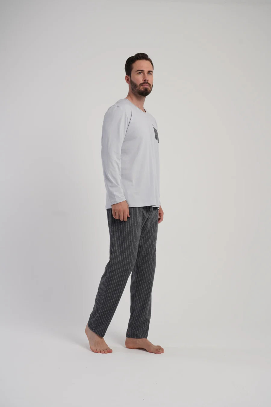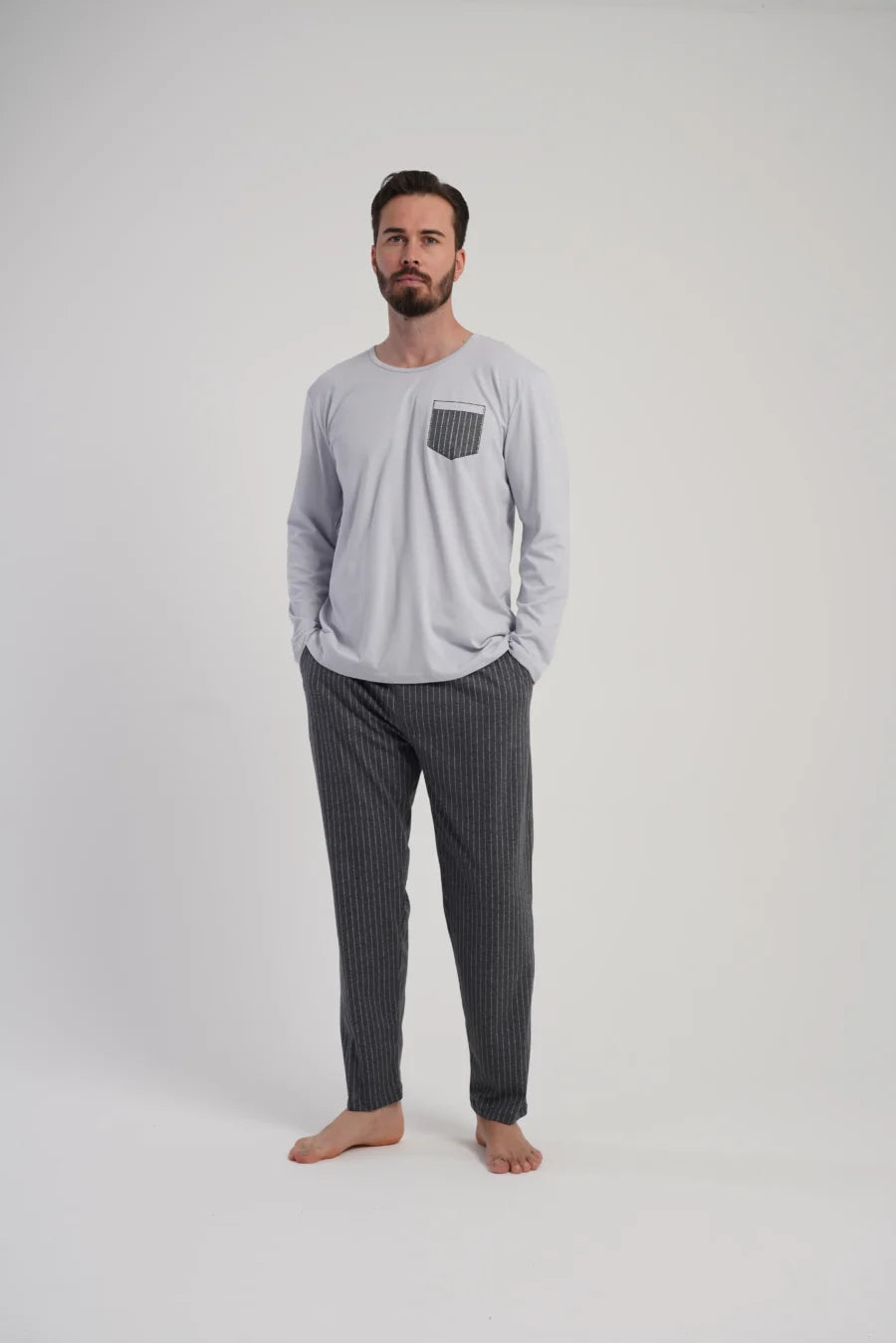 Komfortowa piżama męska BIG SIZE to idealny wybór dla panów ceniących wygodę i klasyczny styl. Zestaw składa się z jasnoszarej bluzki z długim rękawem, ozdobionej kontrastową kieszonką w prążki, oraz spodni w szare prążki.
