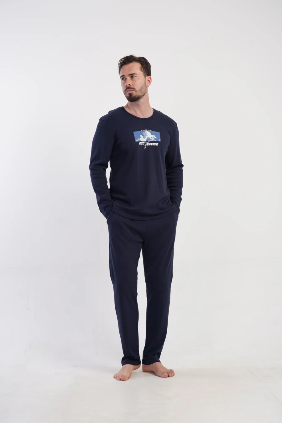 Ta piżama męska bawełniana to doskonały wybór dla panów, którzy cenią komfort, prostotę i nowoczesny styl. Zestaw składa się z granatowej bluzki z nadrukiem „Out of Office” – idealnym motywem na odpoczynek po długim dniu pracy – oraz gładkich spodni w tym samym kolorze, które zapewniają wygodę dzięki elastycznej talii.