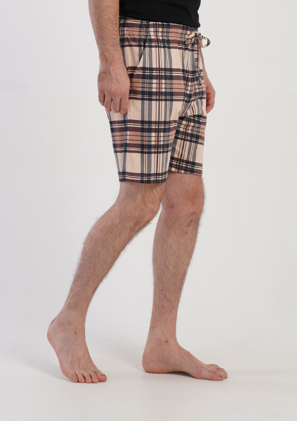 Ponadczasowy wzór w beżowo-brązową kratę z czarnymi akcentami nadaje spodenkom klasycznego, męskiego charakteru. Elastyczna talia z regulacją na troczek umożliwia idealne dopasowanie w pasie, a praktyczne kieszenie boczne zwiększają funkcjonalność i wygodę użytkowania.