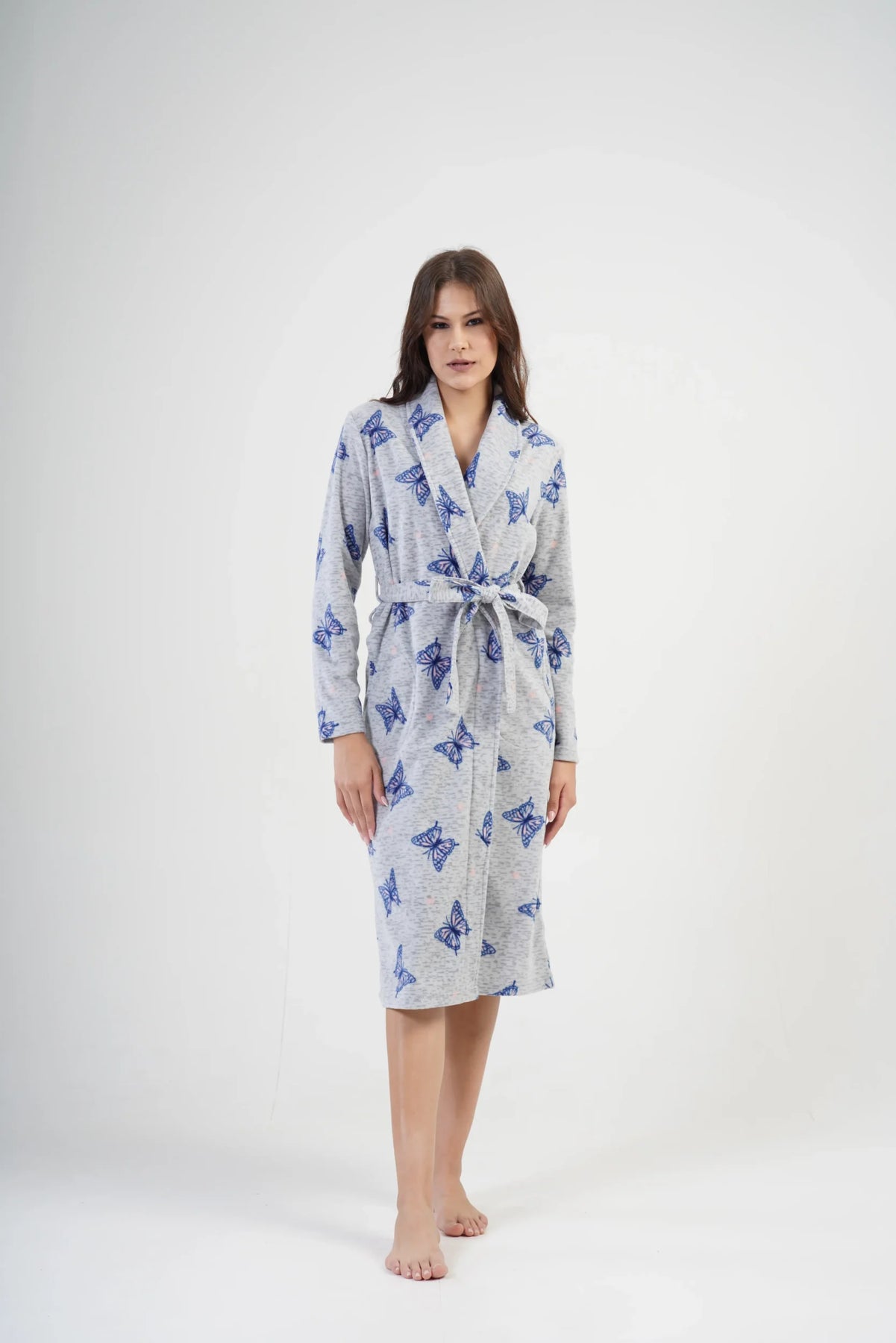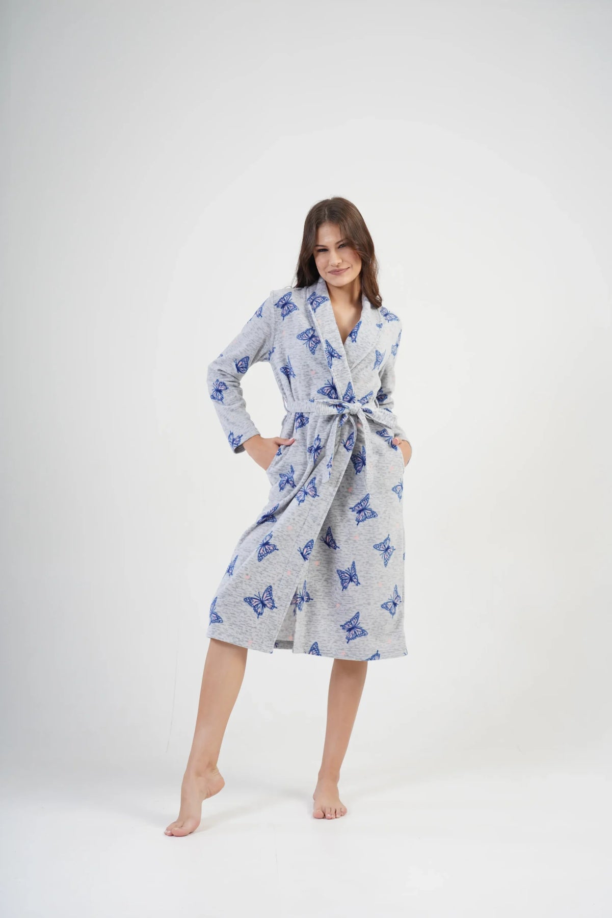 Długi, elegancki szlafrok damski to propozycja dla kobiet, które cenią sobie wygodę i subtelny styl. Wykonany z miękkiego, ciepłego polaru, idealnie otula ciało, zapewniając komfort podczas chłodniejszych dni. Uroczy motyw niebieskich motyli na jasnoszarym tle nadaje całości lekkości i dziewczęcego uroku. Wiązanie w pasie, boczne kieszenie oraz klasyczny kołnierz sprawiają, że szlafrok jest nie tylko praktyczny, ale i wyjątkowo estetyczny. Długość za kolano to dodatkowy atut – świetna ochrona przed zimnem. Idealny na domowe poranki i wieczory.