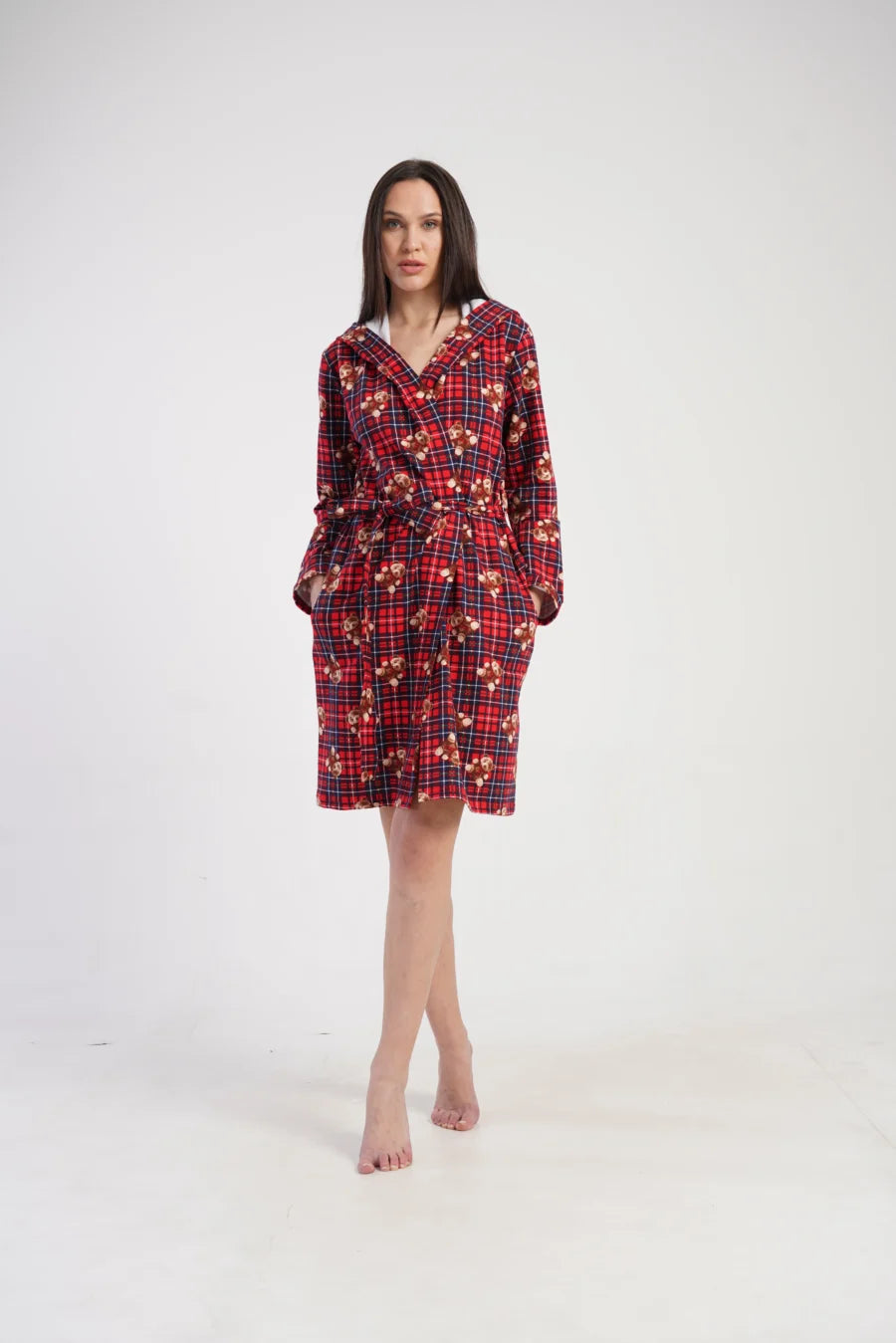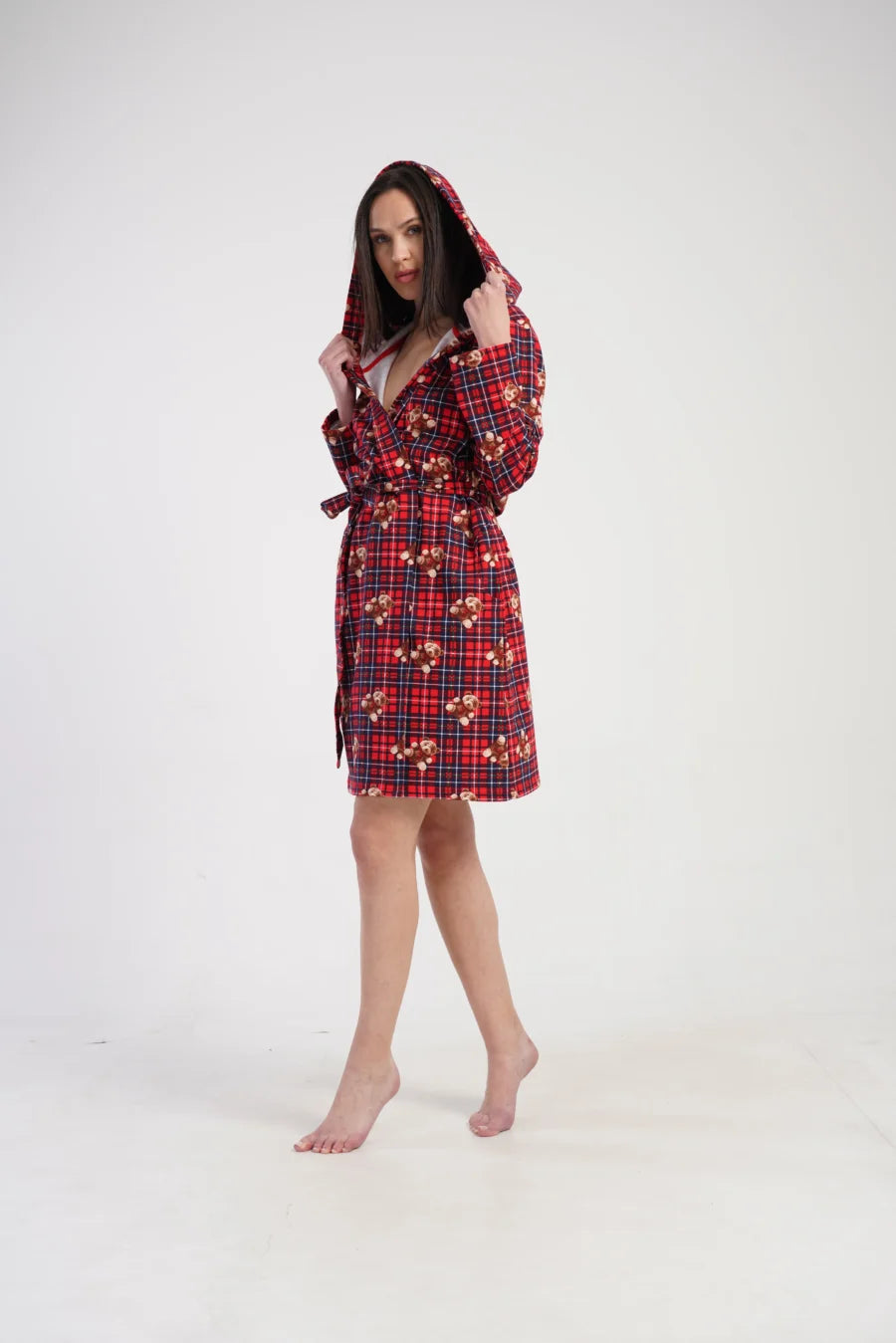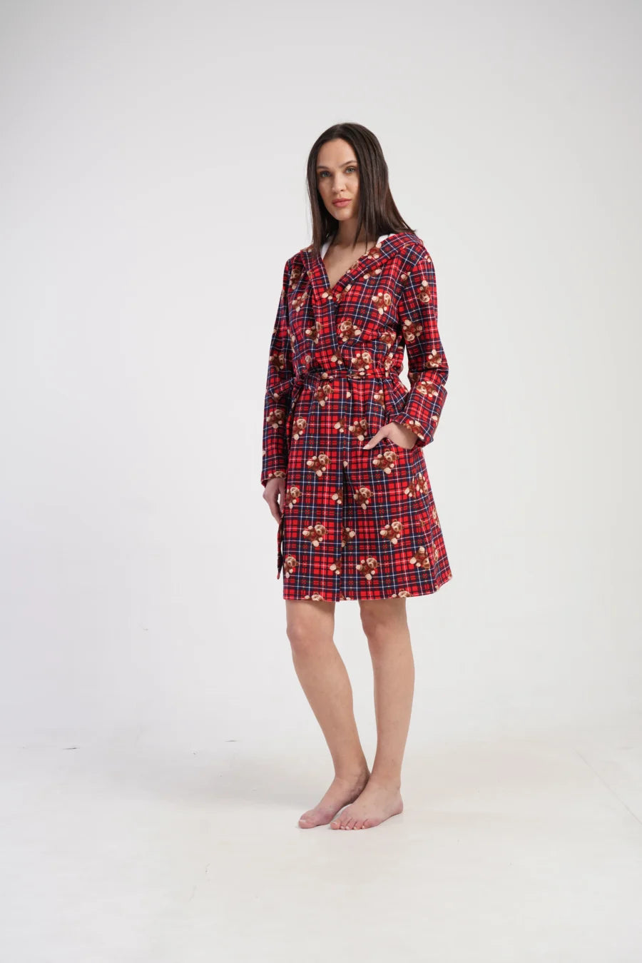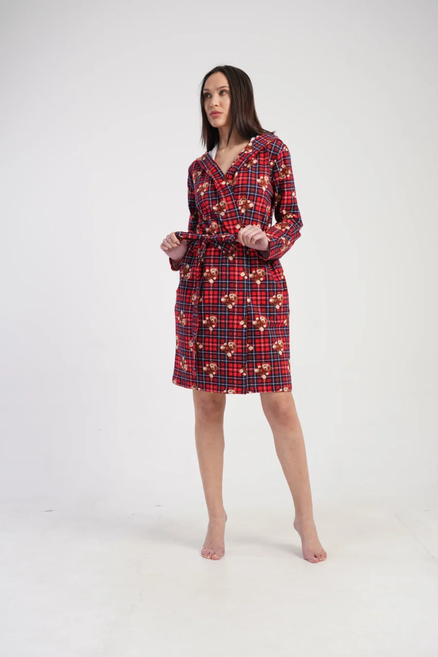 Największą ozdobą jest uroczy wzór w czerwoną kratę z nadrukiem misiów, który sprawia, że szlafrok prezentuje się wyjątkowo ciepło i świątecznie. To doskonały wybór na zimę, a także świetny pomysł na prezent.