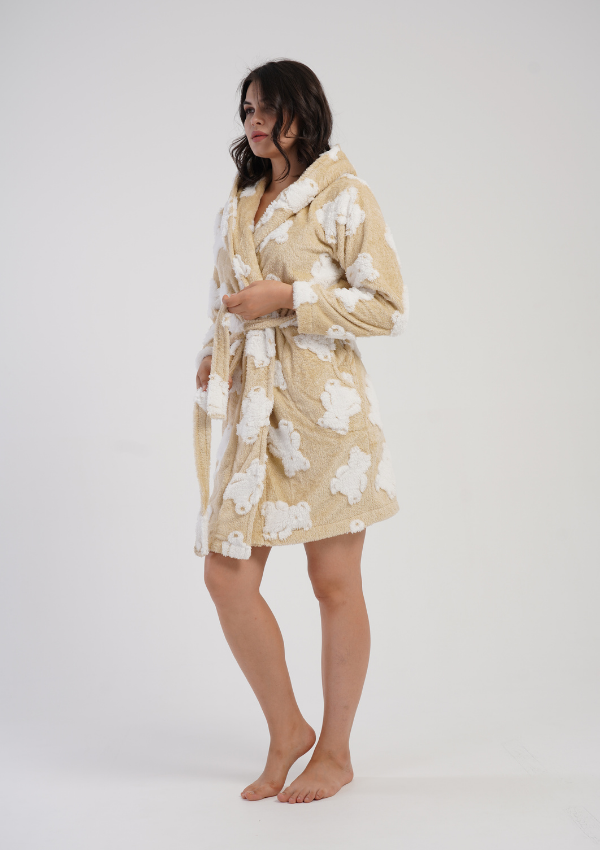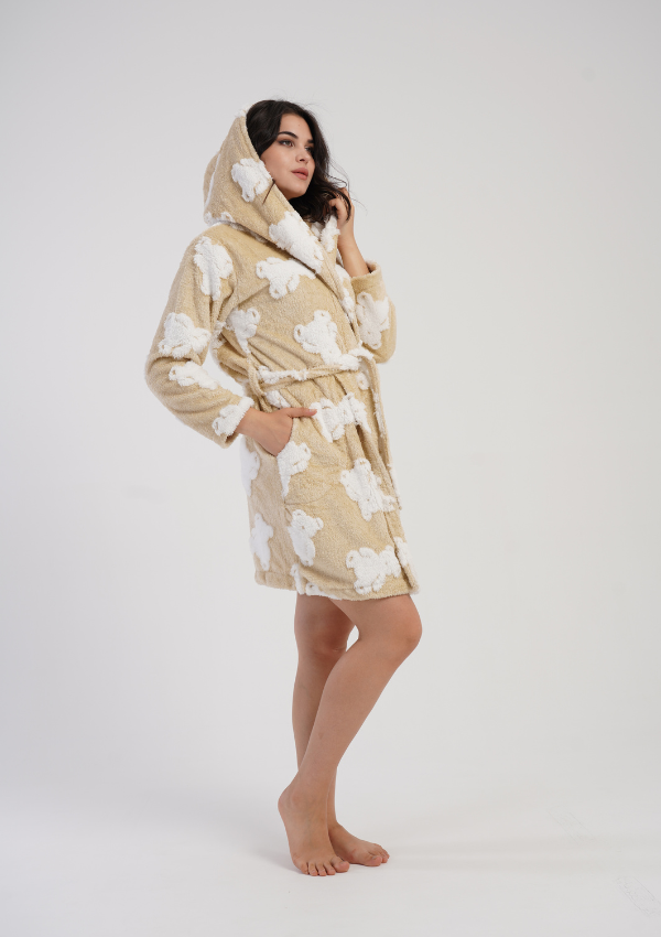 Model o długości do kolan posiada kaptur, pasek w talii oraz praktyczne kieszenie po bokach, które zwiększają wygodę codziennego użytkowania. Uroczy wzór w białe misie na beżowym tle dodaje mu dziewczęcego uroku i sprawia, że prezentuje się wyjątkowo stylowo.