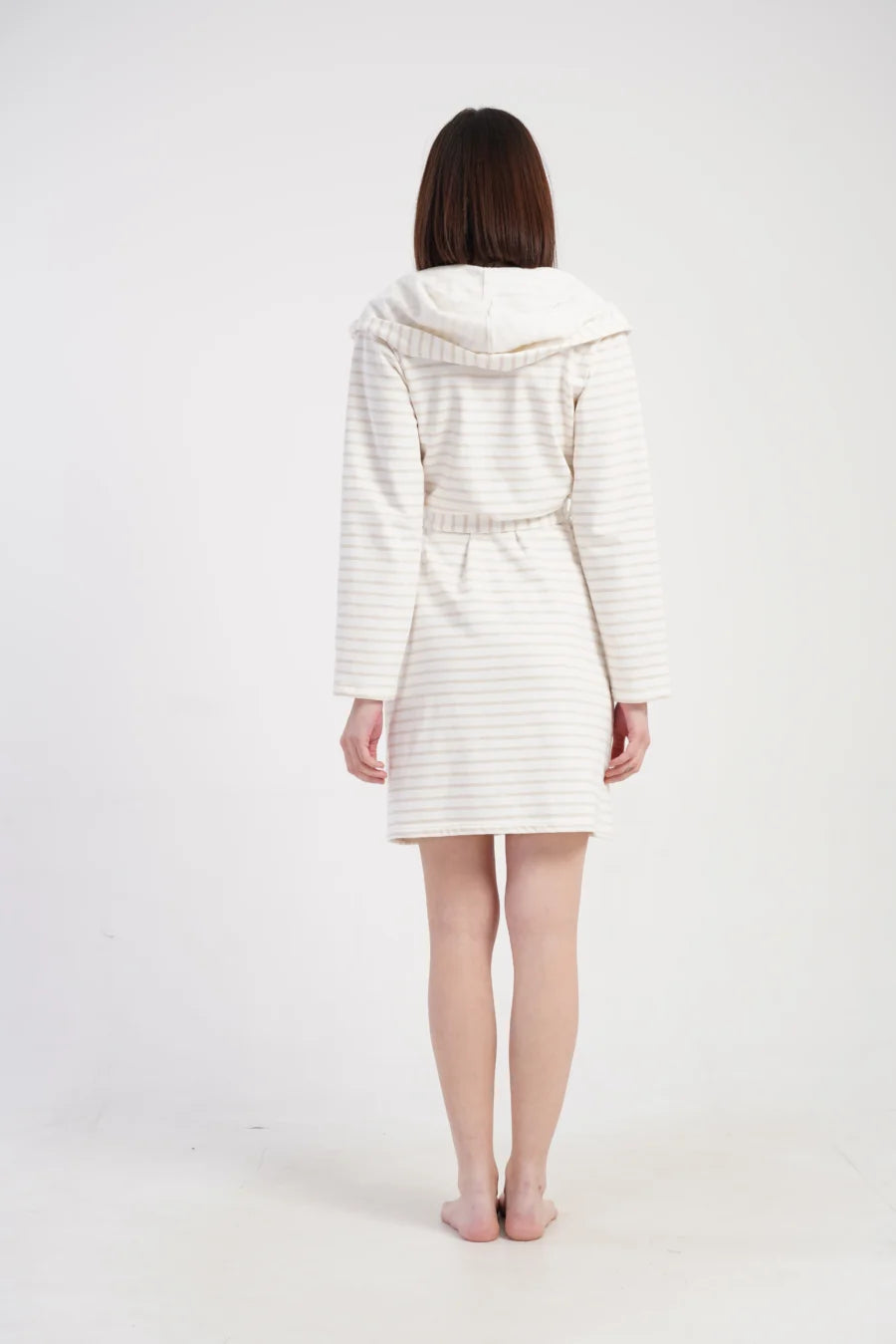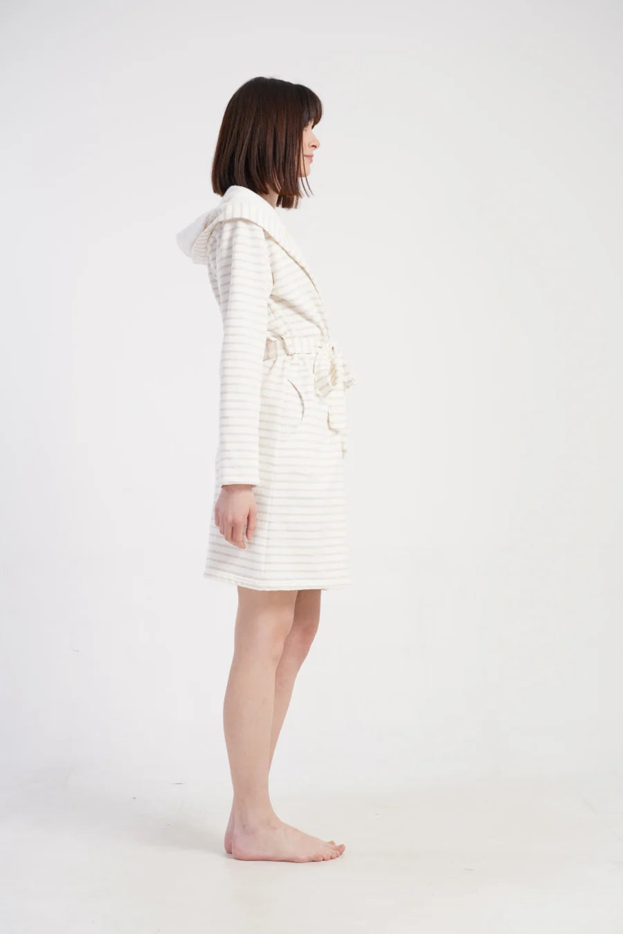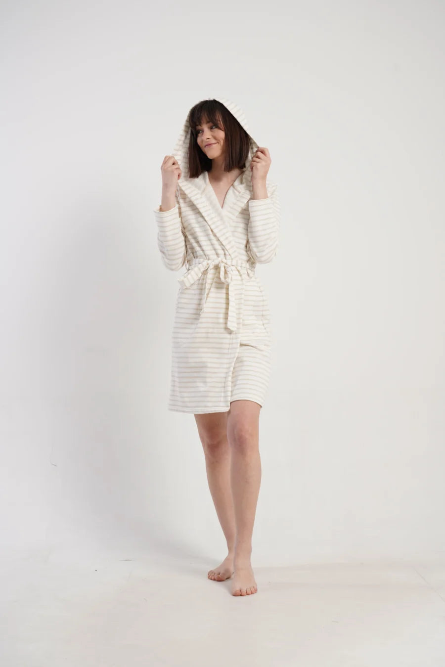 Model o długości do kolan posiada wygodny kaptur, wiązanie w talii, a także praktyczne kieszenie boczne. Jasny kremowy odcień z subtelnymi beżowymi paskami dodaje całości eleganckiego, ponadczasowego charakteru. To szlafrok, który sprawdzi się zarówno w domowym zaciszu, jak i podczas wyjazdu.