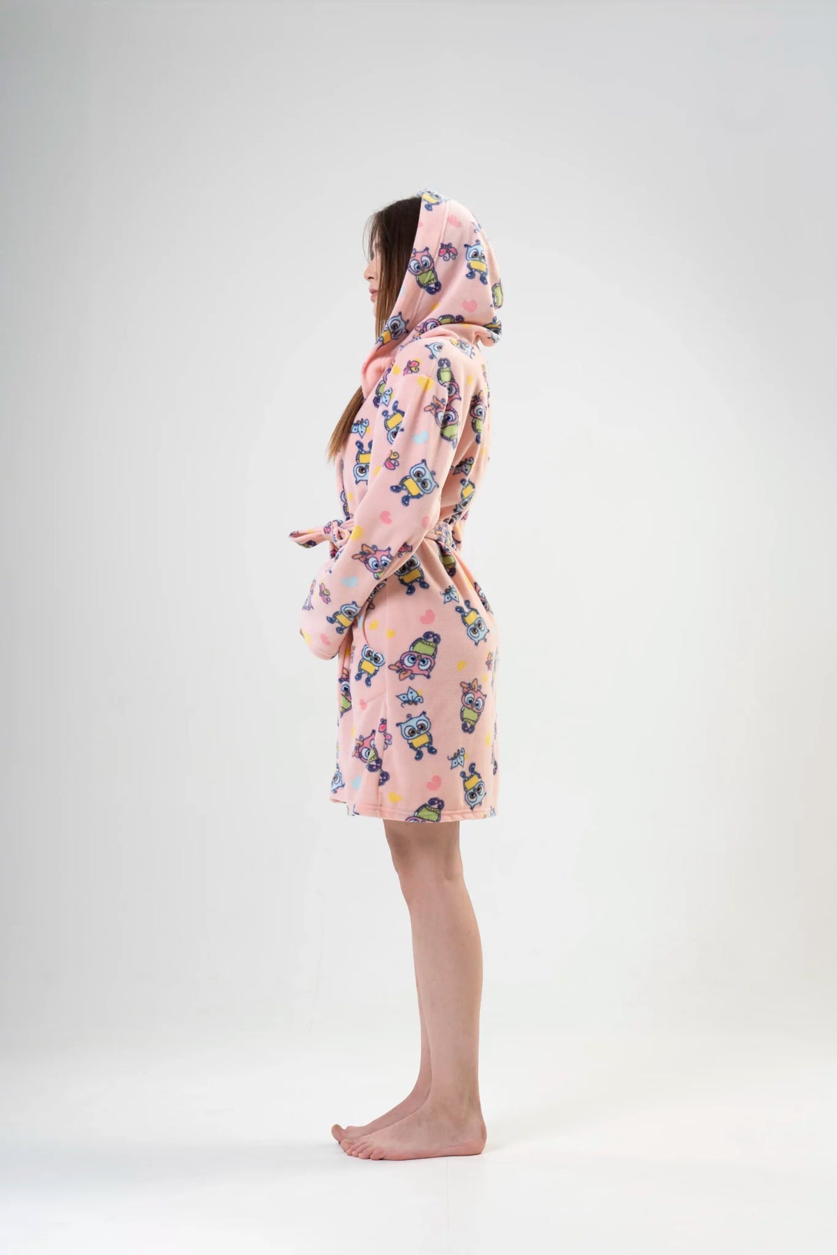 Szukasz ciepłego, a jednocześnie zabawnego szlafroka na chłodniejsze dni? Ten uroczy model z miękkiego polaru to doskonały wybór! Krótki fason, przytulny kaptur i praktyczne kieszenie boczne sprawiają, że jest niezwykle funkcjonalny, a wesoły wzór z kolorowymi robotami i serduszkami dodaje mu młodzieńczego uroku.