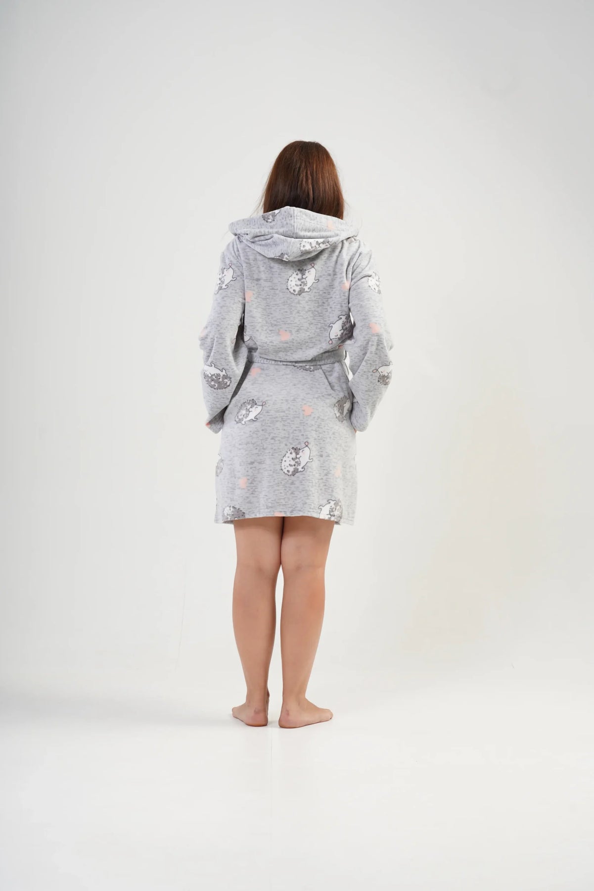 Ciepły, miękki i uroczy – szlafrok damski w wersji plus size to idealny wybór na domowe wieczory i poranki. Utrzymany w jasnoszarej kolorystyce z wesołym wzorem jeżyków i różowych serduszek. Fason z kapturem, wiązaniem w pasie i praktycznymi kieszeniami świetnie sprawdzi się w chłodniejsze dni. Polarowy materiał otula ciało ciepłem i miękkością, zapewniając wyjątkowy komfort noszenia. Ten szlafrok pokochają wszystkie kobiety ceniące wygodę i odrobinę domowego uroku.
