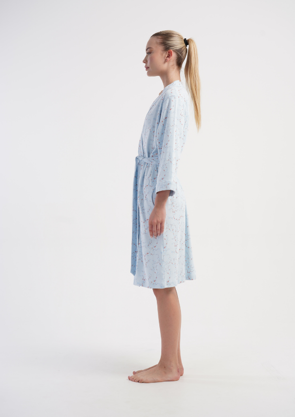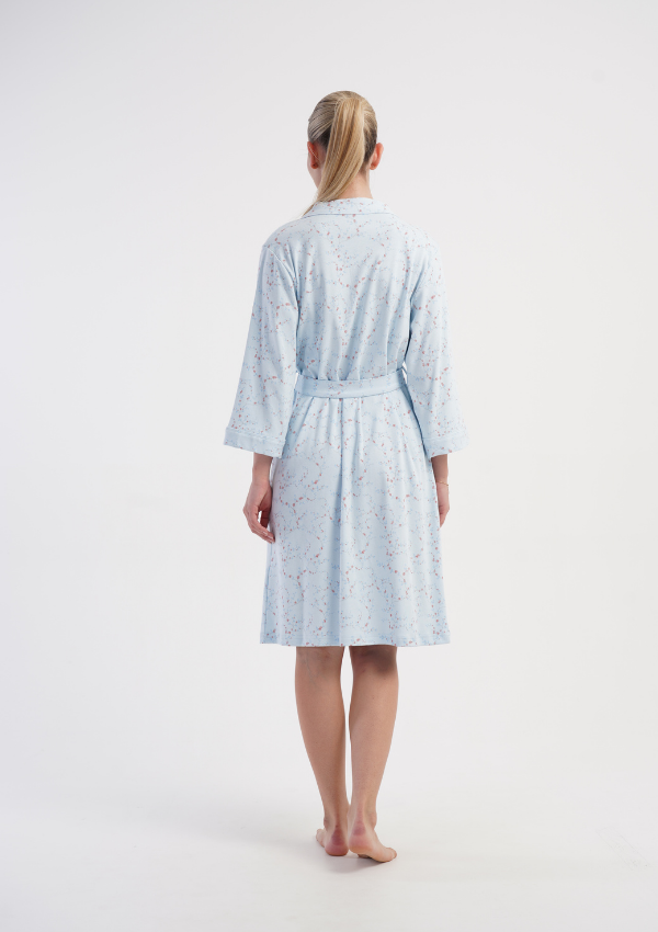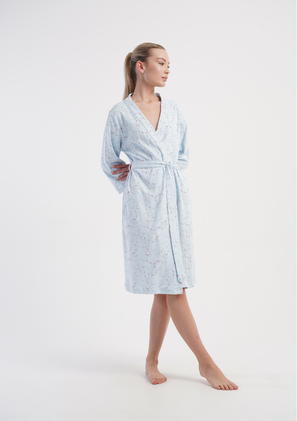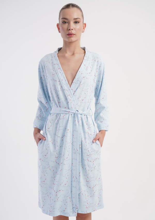 Jasnobłękitny kolor w połączeniu z delikatnym, pastelowym wzorem nadaje całości świeżości i lekkości, dzięki czemu szlafrok prezentuje się kobieco i estetycznie. Fason wiązany w talii umożliwia idealne dopasowanie do sylwetki, a praktyczne kieszenie po bokach sprawiają, że szlafrok jest niezwykle funkcjonalny.