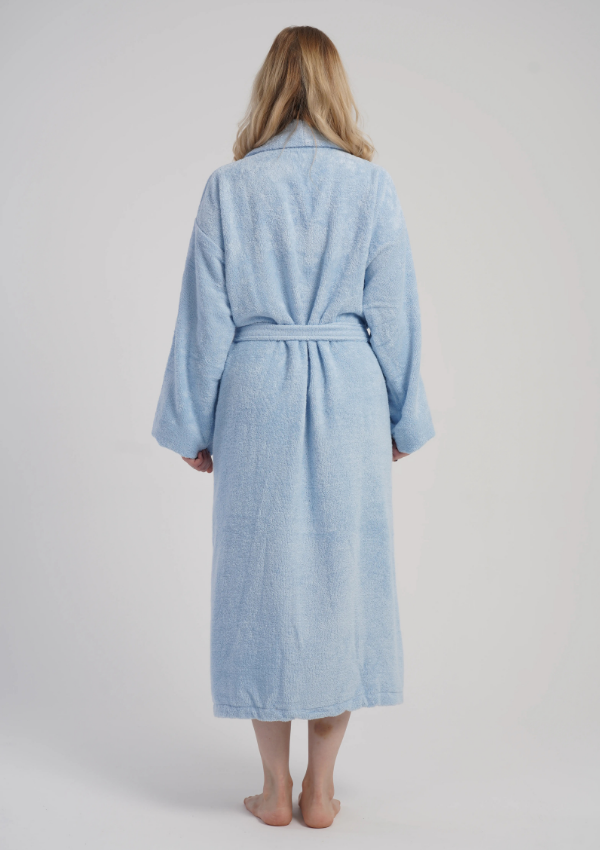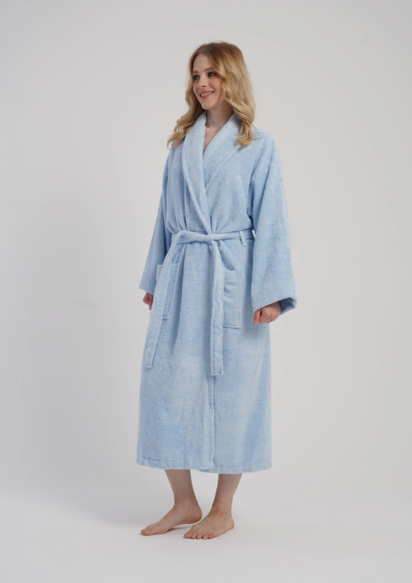 Stonowany, niebieski kolor sprawia, że szlafrok prezentuje się uniwersalnie i elegancko – doskonały wybór do domowej garderoby oraz na prezent.