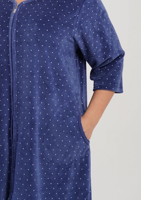 Model zapinany jest na suwak na całej długości, co ułatwia zakładanie i zdejmowanie, a także świetnie sprawdza się jako lekka narzutka na koszulę nocną. Rękawy o długości ¾ gwarantują swobodę ruchów, a dwie praktyczne kieszenie pozwalają wygodnie przechować drobiazgi.