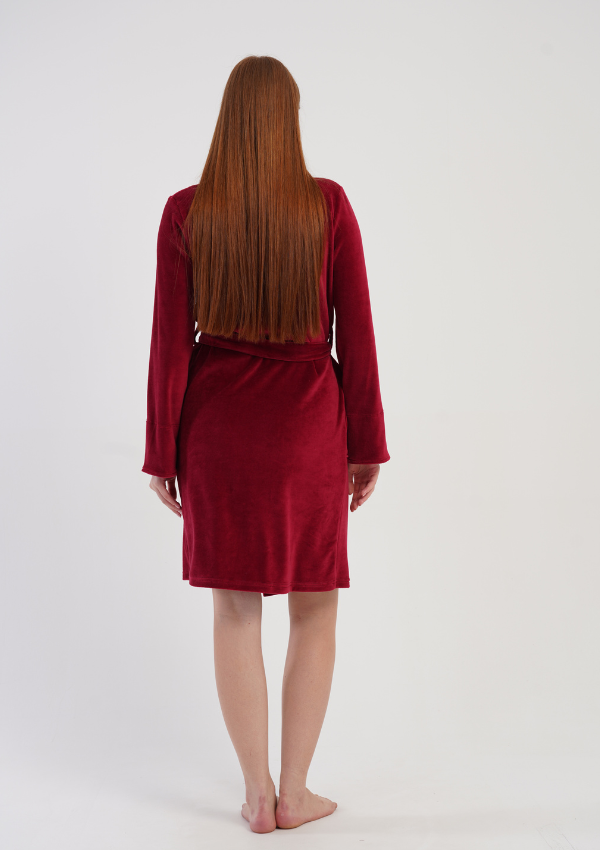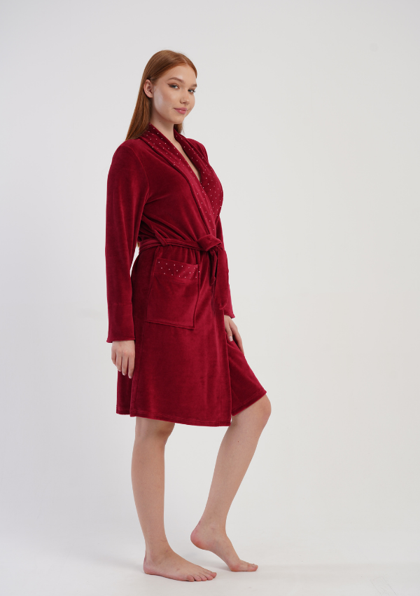 Głęboki, bordowy kolor nadaje szlafrokowi elegancki charakter, a dekoracyjne, delikatnie połyskujące kropeczki na kołnierzu, mankietach i kieszeniach wprowadzają nutę subtelnego glamour.