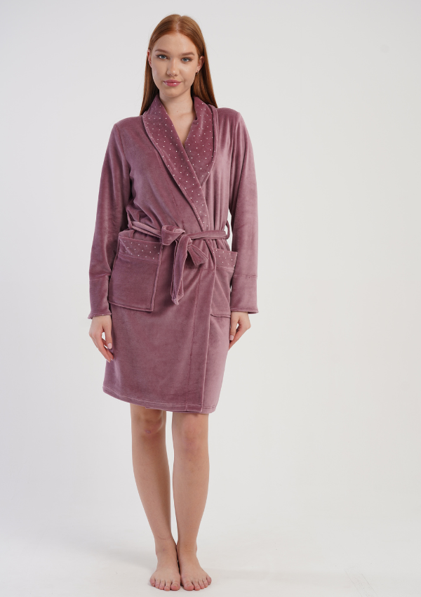 Głęboki, śliwkowy kolor nadaje szlafrokowi elegancki charakter, a dekoracyjne, delikatnie połyskujące kropeczki na kołnierzu, mankietach i kieszeniach wprowadzają nutę subtelnego glamour.