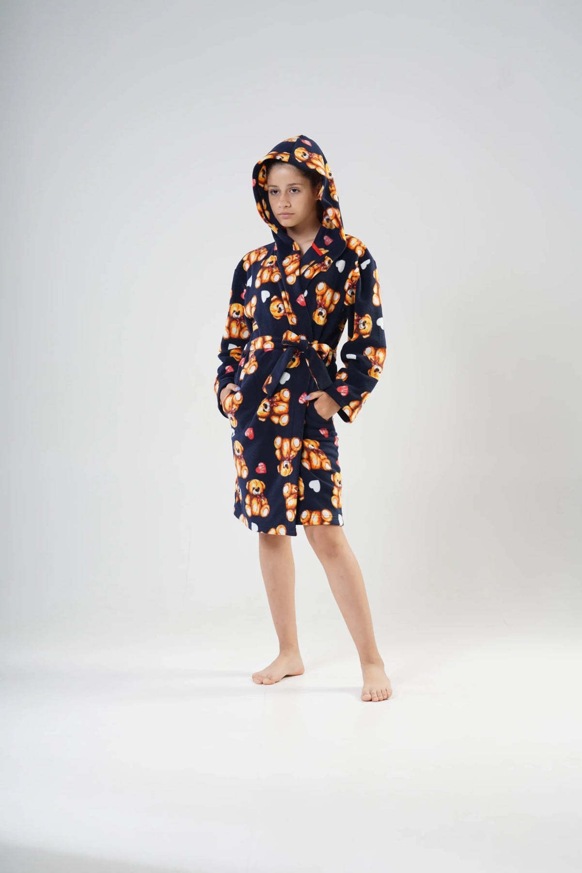 Wzór w słodkie misie i kolorowe serduszka na granatowym tle spodoba się każdemu dziecku, a praktyczny kaptur, wiązanie w pasie i boczne kieszonki dodają funkcjonalności. Świetny wybór do domu, po kąpieli lub jako ciepłe okrycie rano.