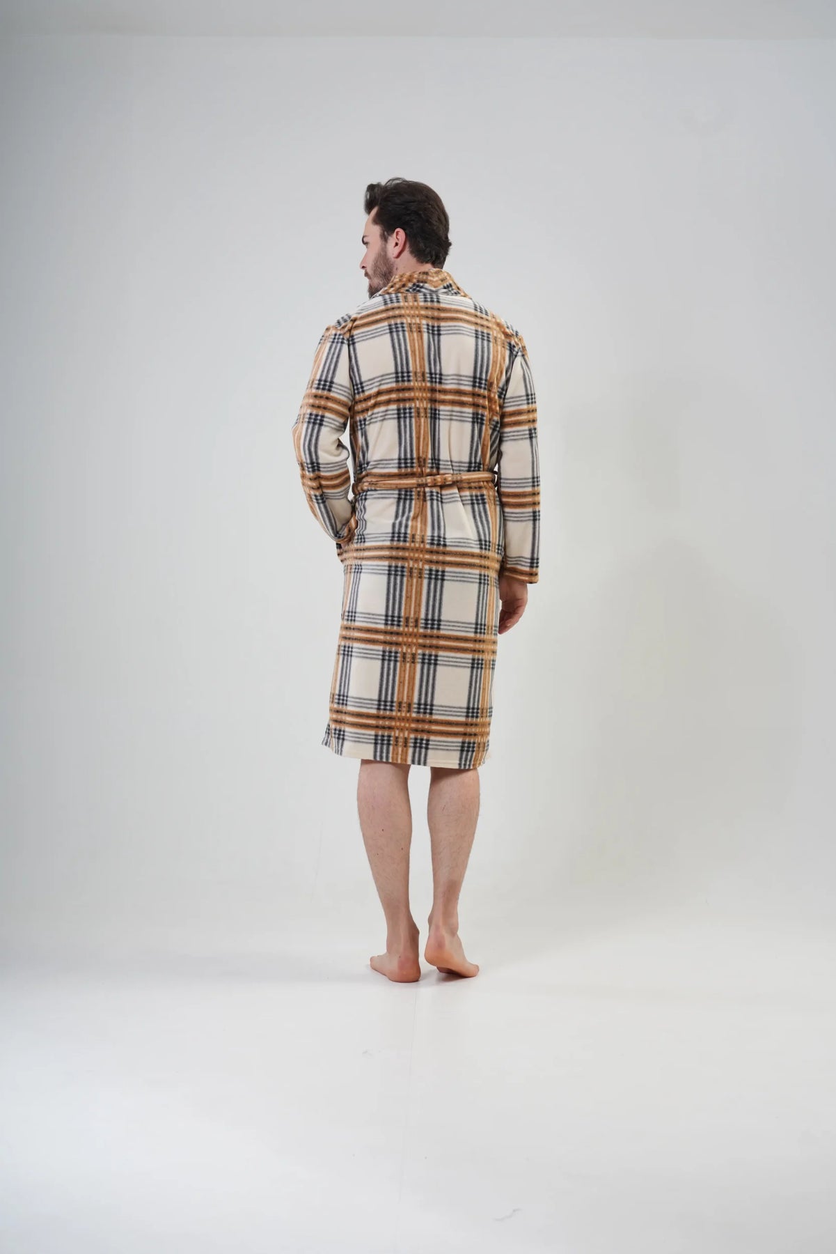 Szlafrok ma stylowy wzór w kratę w odcieniach beżu, karmelu i czerni, który nadaje mu ponadczasowego charakteru. Prosty fason i długość do kolan gwarantują swobodę ruchów, a wysokiej jakości polar sprawia, że model jest nie tylko modny, ale także niezwykle praktyczny.