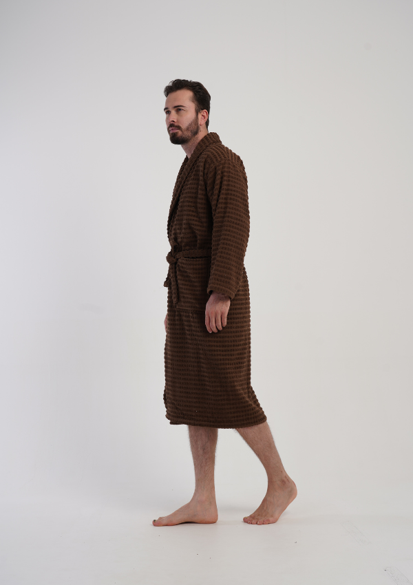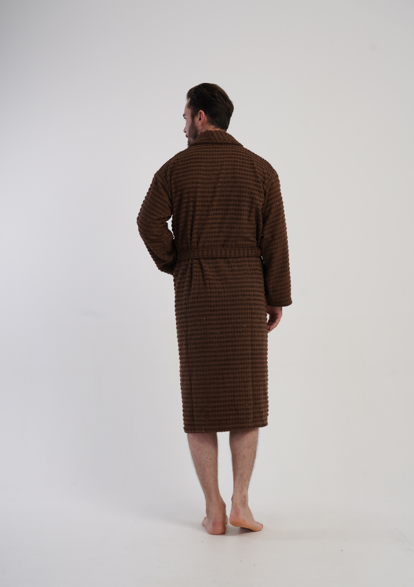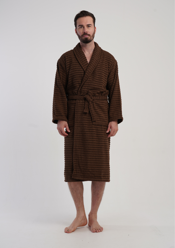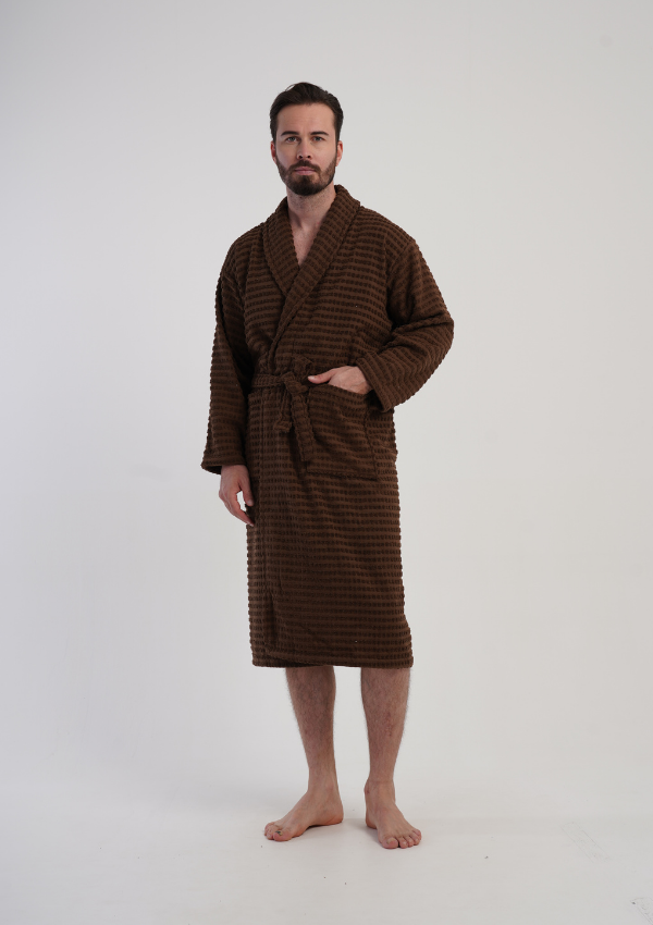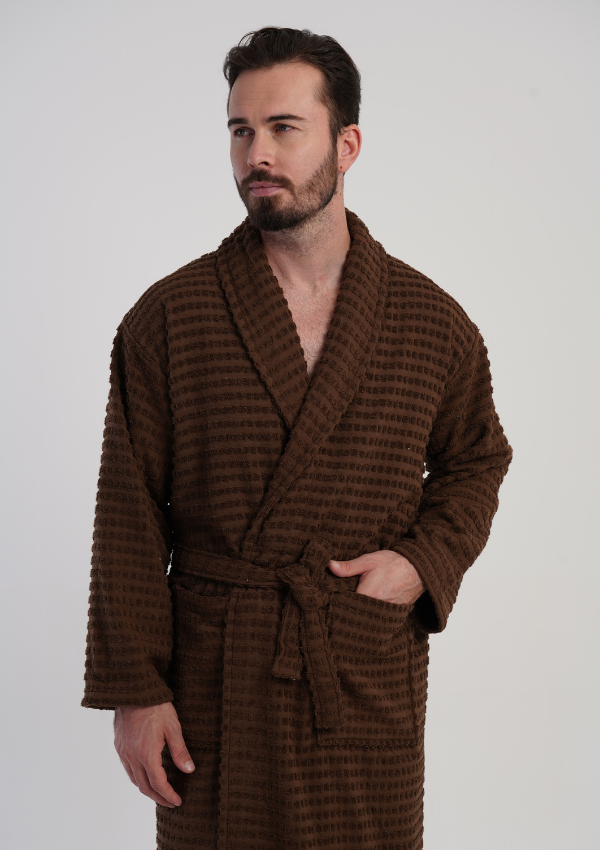 Klasyczny krój z kołnierzem szalowym dodaje całości eleganckiego, męskiego charakteru. Wiązanie w pasie umożliwia idealne dopasowanie do sylwetki, a dwie praktyczne kieszenie pozwalają wygodnie przechować drobiazgi.