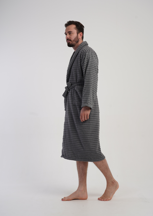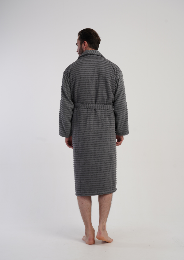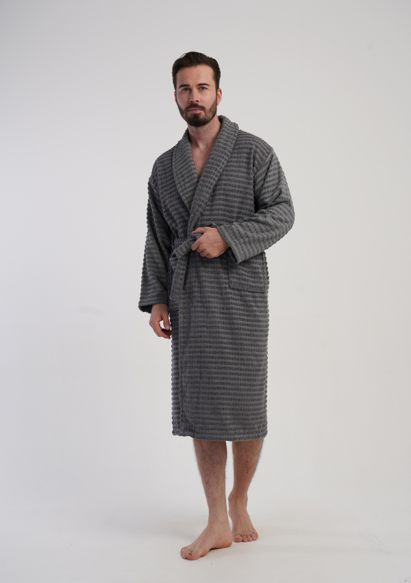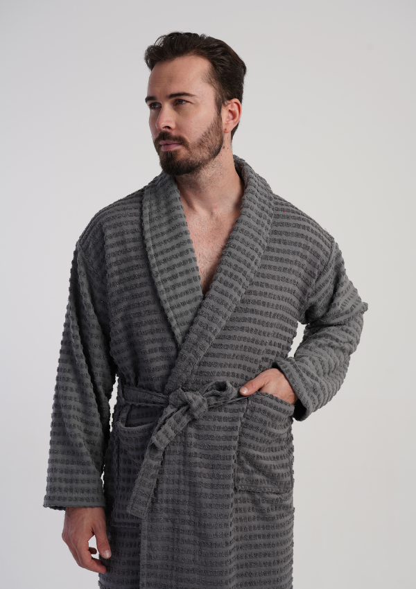 Klasyczny krój z kołnierzem szalowym dodaje całości eleganckiego, męskiego charakteru. Wiązanie w pasie umożliwia idealne dopasowanie do sylwetki, a dwie praktyczne kieszenie pozwalają wygodnie przechować drobiazgi.