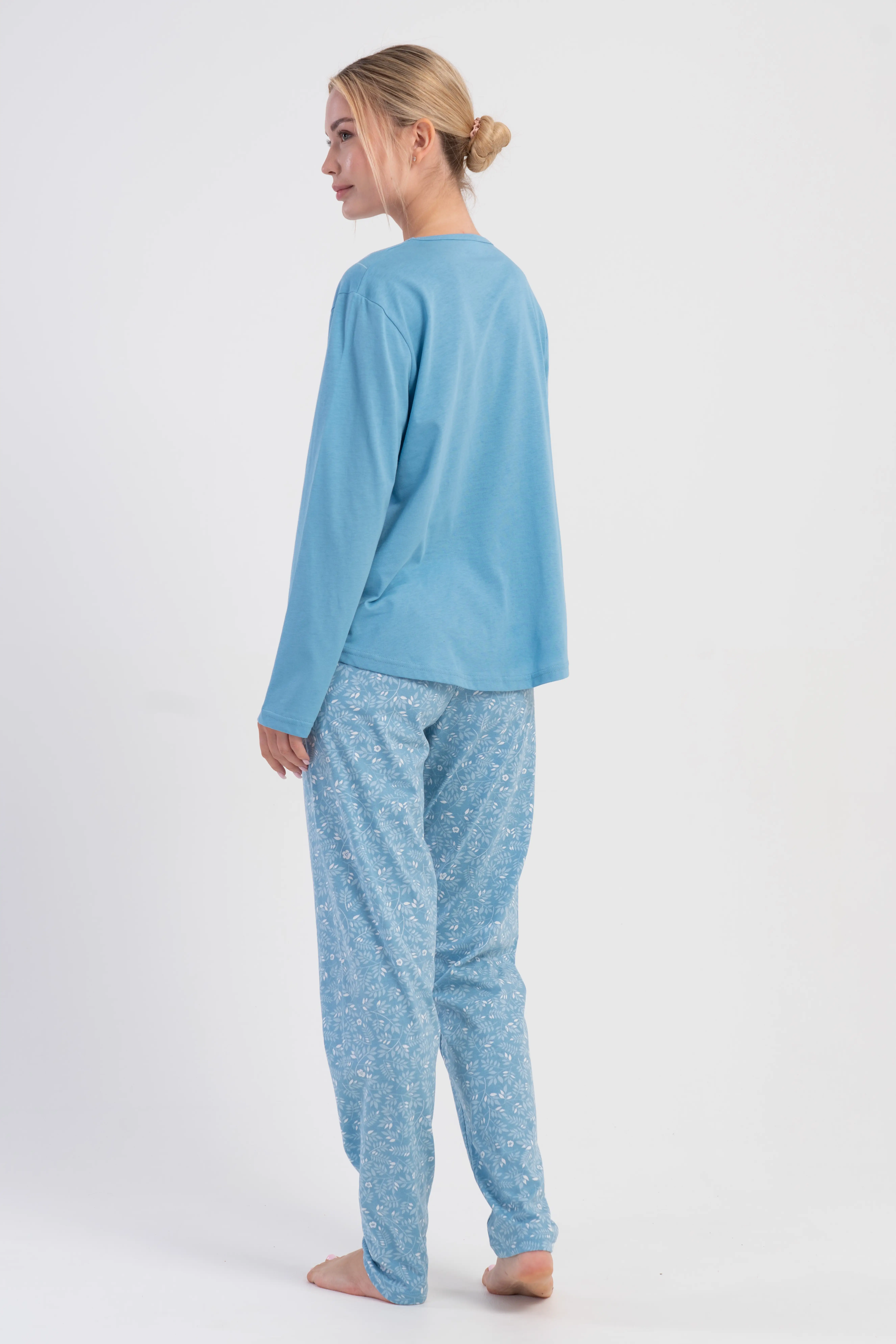 Komfortowa i elegancka piżama damska Vienetta BIG SIZE to propozycja dla kobiet, które cenią wygodę i styl przez cały rok. Zestaw składa się z niebieskiej bluzki z dekoltem w serek, ozdobionej subtelnym białym nadrukiem kwiatowym na ramieniu, oraz jasnoniebieskich spodni pokrytych drobnym, roślinnym wzorem.