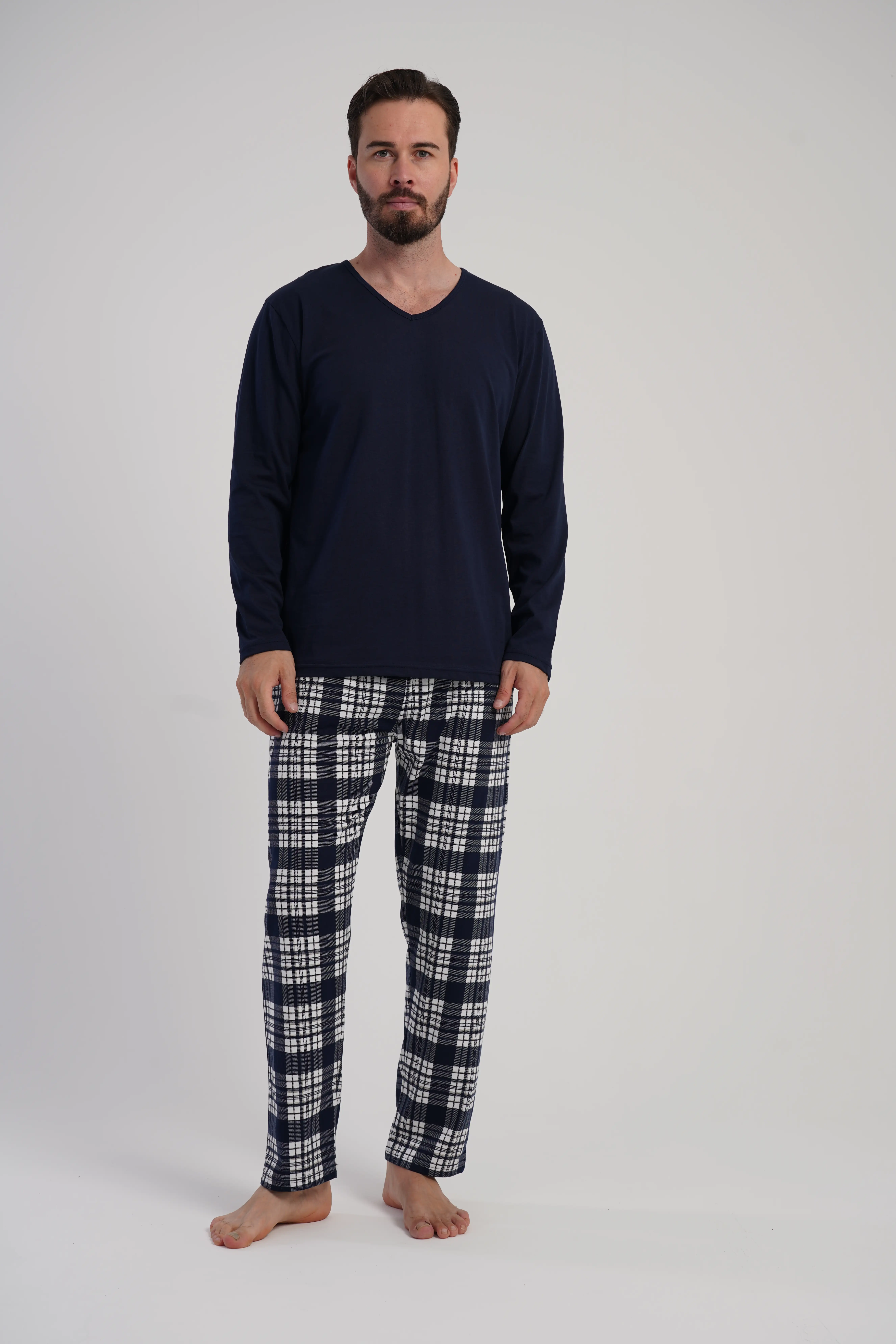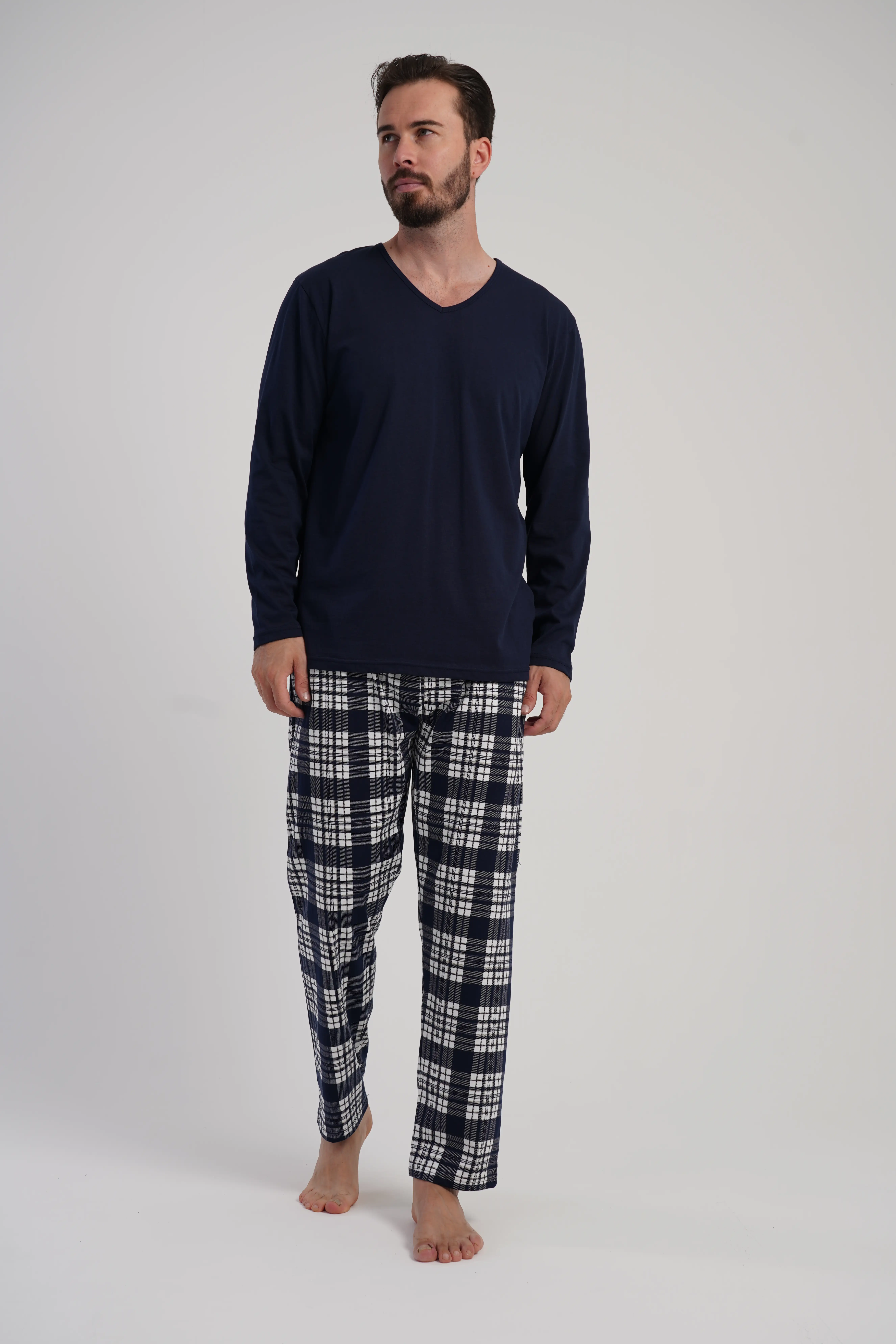 Granatowa bluzka z długim rękawem. Do kompletu dołączone są spodnie w kratę – elastyczna talia sprawia, że piżama idealnie dopasowuje się do sylwetki.